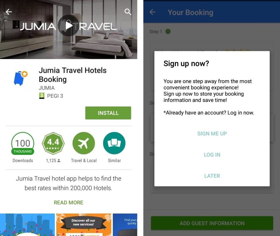 A great example of this is the simple pop-up registration request used by the Jumia Travel Hotels Booking App. It provides the opportunity for users to register and lists the benefits of registration. It also features a ‘later’ button, making it easy to exit for those who do not wish to register.