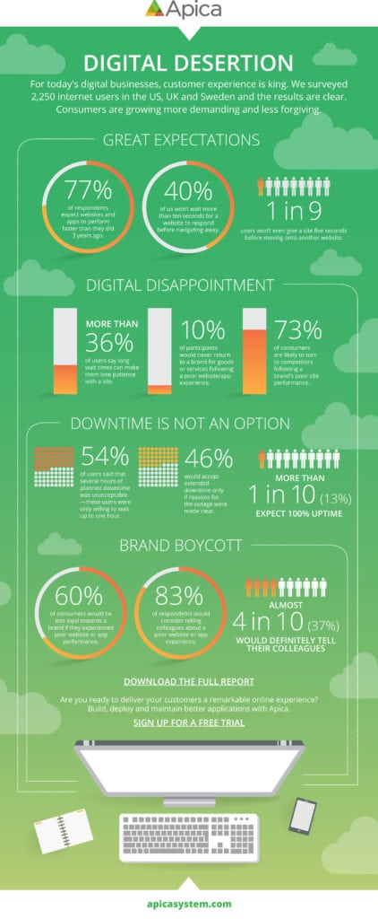 Good customer experience is everything today. A study by Apica revealed that 77% of respondents expect websites and apps to perform faster than they did three years ago and 40% won’t wait more than 10 seconds for the web to respond before navigating away. This infographic by Apica shows what customers won’t tolerate when it comes to your website.
