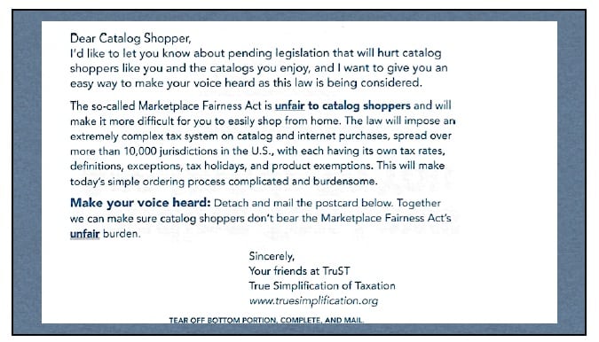 According to the postcard, which was obtained by Multichannel Merchant from TruST, catalogers say that the Marketplace Fairness Act is “unfair to catalog shoppers” because it will make it more difficult for shoppers to purchase products from home. The postcard states that the proposed act “will make today’s simple ordering process complicated and burdensome.”