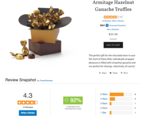 Make sure the website provides a great experience for shoppers and includes plenty of information about the products and the stores. Go beyond product descriptions to prominently feature product ratings and reviews on the website and mobile apps. In addition to providing shoppers with the information they’re looking for, featuring user-generated content on the website can also ensure the product pages are showing up in search engine results. PowerReviews found that when a product goes from having no reviews to having at least one review, the product page experiences a 108% lift in traffic, on average.