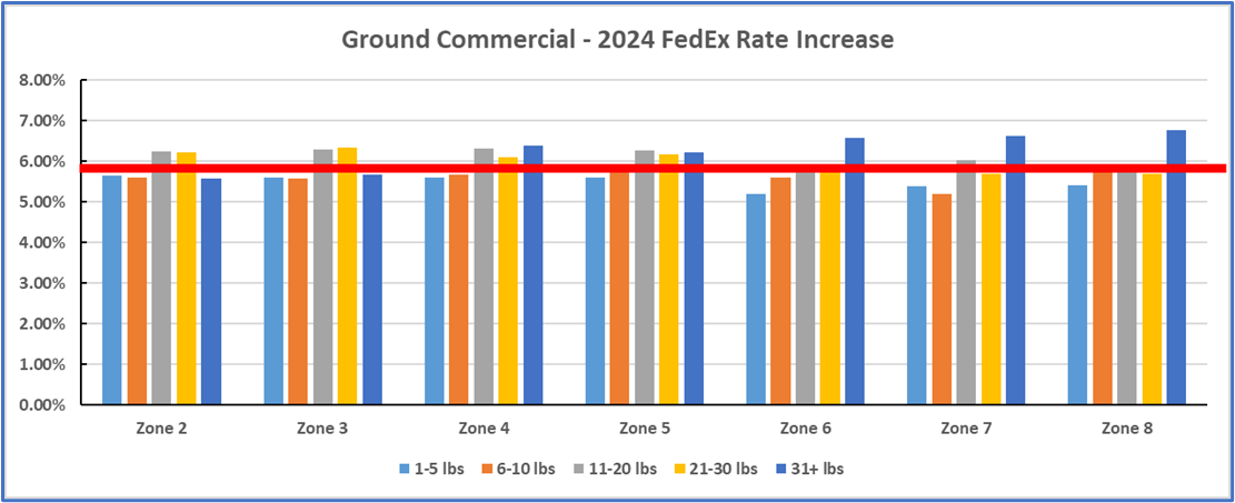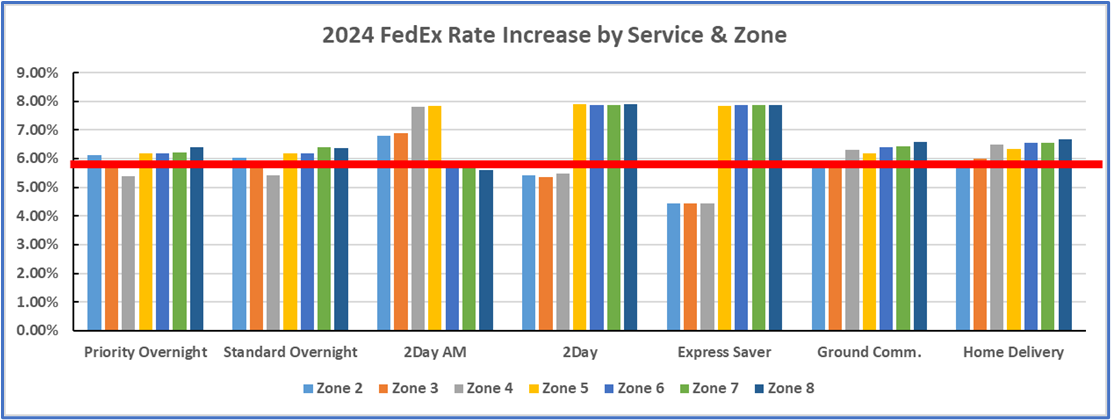 With the exception of Two-Day AM, FedEx raised rates above 5.9% for all shipments to zones 5-8. Conversely, most services see a smaller increase for zones 2-4. FedEx may be telegraphing one of two things: