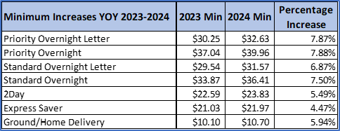 For shippers with existing discounts, the minimum charge or floor price operates hand in hand with the rate increase. The floor price gives additional protection to FedEx from any discounts it has already conceded. For example, even if you have a 100% discount, you would pay $10.10 for a ground shipment in 2023, or $10.70 in 2024, without negotiating minimum concessions. Yearly minimum charge increases can have a dramatic impact on your shipping costs.