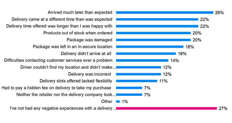 While the increase in ecommerce buying and delivery is good news for merchants, the bad news is that only 34% of consumers said delivery processes have improved (see Figure 1). Worse still, almost three-quarters (73%) of consumers experienced a delivery failure (see Figure 2), with almost one-quarter (23%) indicating they did not order from that retailer again. Top issues cited were late delivery (26%), followed by “delivery not arriving when expected” and “length of time to make delivery (tied at 22%).