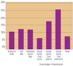 How do shippers charge back shipping costs? Results from a 2008 Parcel survey (Figure 2) revealed that 46% charge back actual carrier costs, including surcharges, with 59% of that group including a handling fee (27% of all survey respondents). Other common charge-back methods include flat shipping rates for all orders (13.5%), basing the shipping charges on the order value (11.5%), and charging the customer at the carrier’s published (undiscounted) rates (13%).