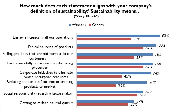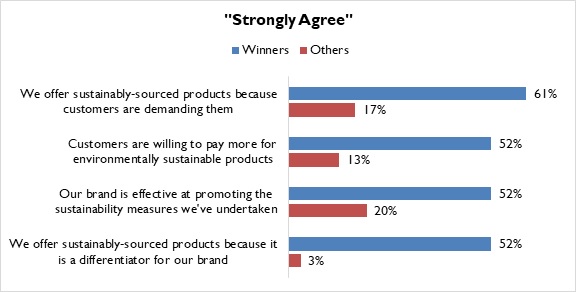 The message is clear: retailers should be concerned about sustainability because consumers are concerned. Furthermore, while over-performing Retail Winners are already viewing sustainability as a competitive differentiator, it will soon be table stakes for all retailers. But by that time, laggards will be far behind the leaders.