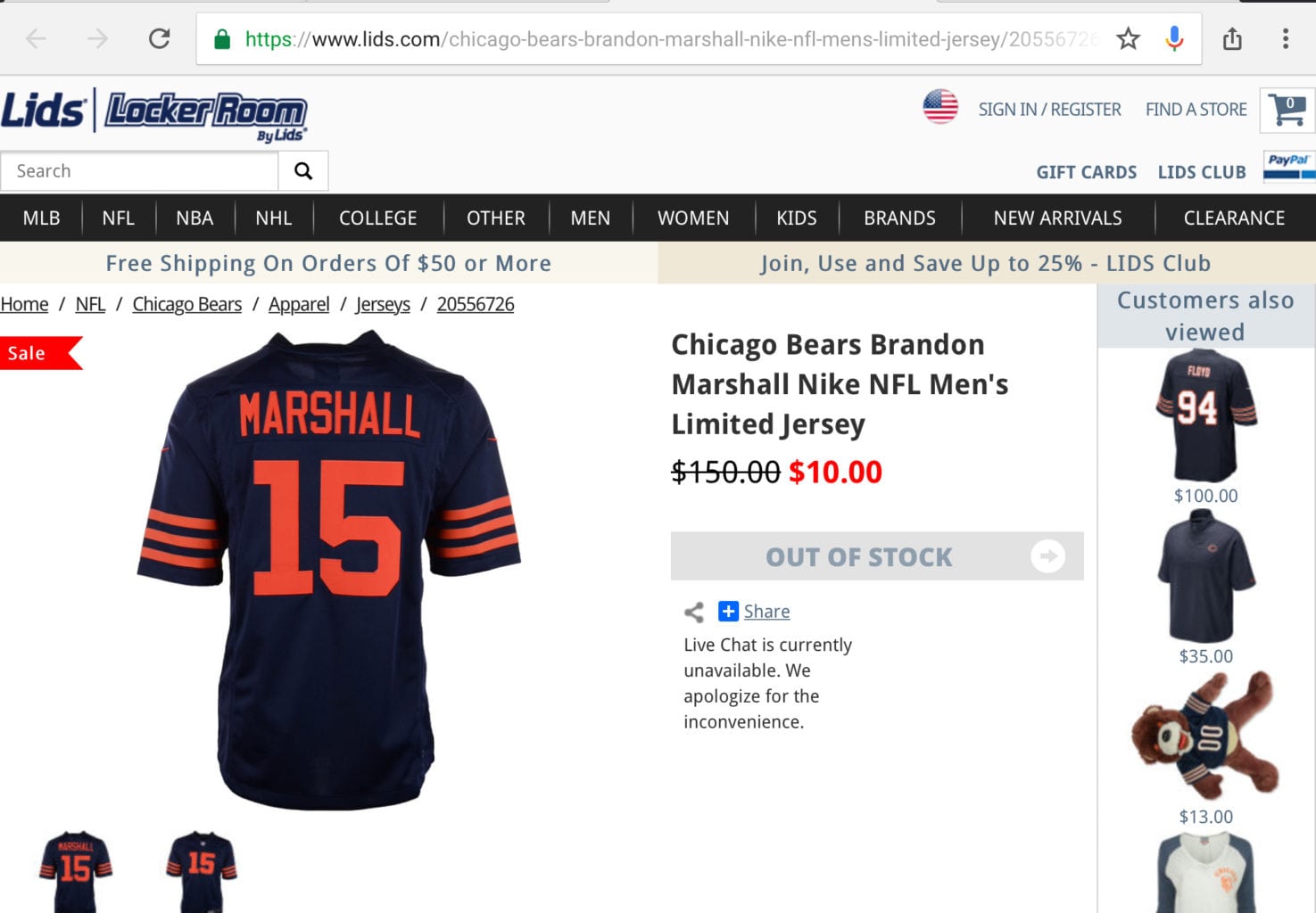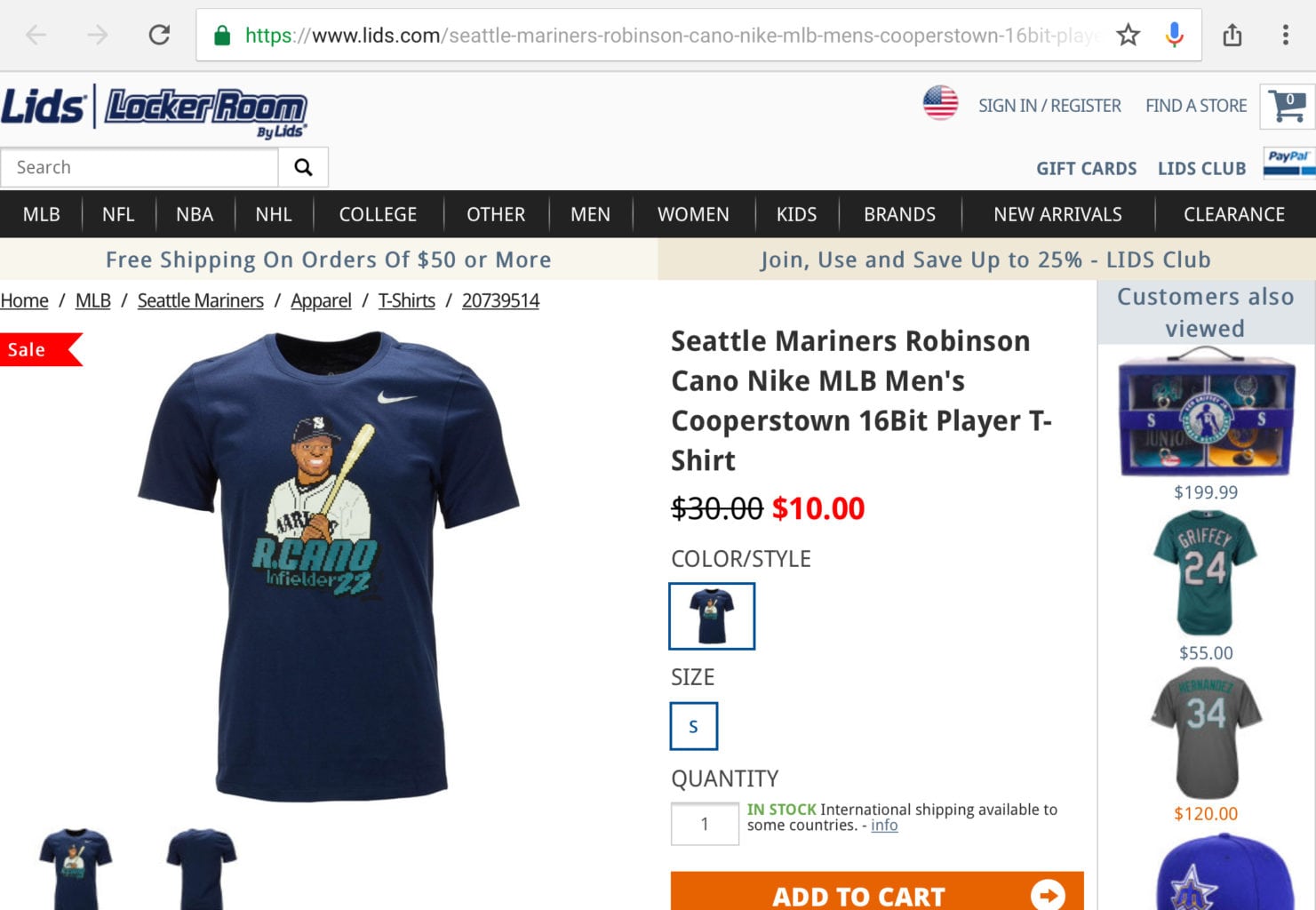 But as you can see here, two items I clicked on in the Lids ad were out of stock, and a third was only available in a size S – which is my hat size, but far from being my shirt size: