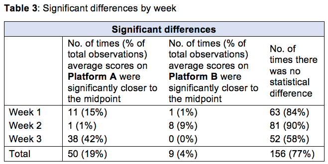 A second study we conducted tested whether this observed midpoint drift could be replicated in a different set of questions while controlling for the direction of scales, complexity of matrix attributes and length of the matrix question. Results showed that the table format does have some impact on questions that are more involved for the respondent to process. Also, when the amount of effort required for reading and comprehension was amplified, it translated into a longer amount of time spent on each matrix.