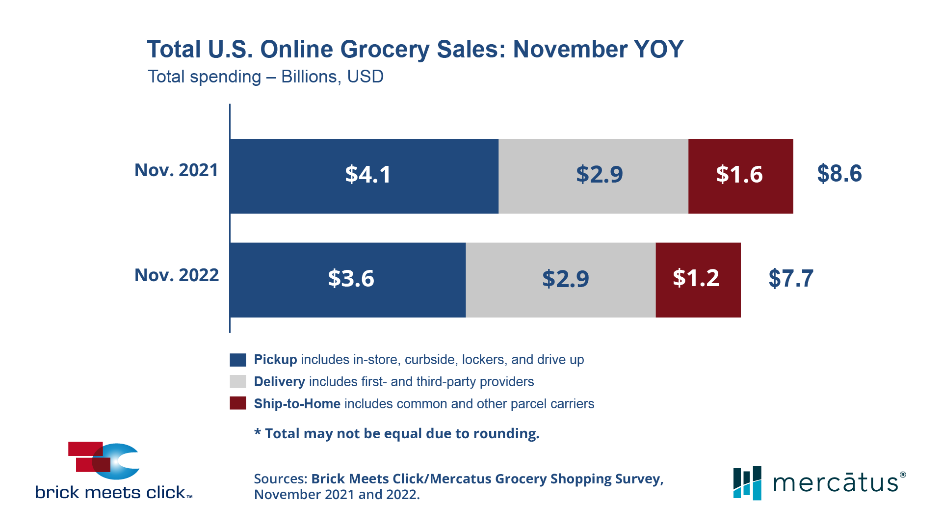 Domestic e-grocery sales continued on a downward trajectory from pandemic-fueled highs, decreasing 10% year-over-year in November to $7.7 billion, down slightly from $7.8 the two prior months, according to the latest data from Brick Meets Click and Mercatus.