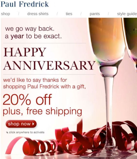 The email from men’s clothing provider Paul Fredrick specifically highlights the first year anniversary.