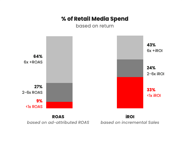 Retail media can be incredibly efficient: 43% of the spend had an iROI of 6x or greater, on par with other highly efficient media channels.