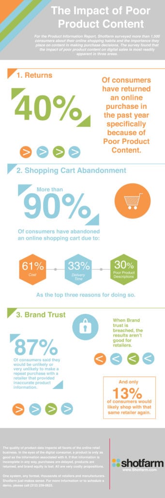 Product content can have an impact on online sales. This infographic by Shotfarm unveils that 78% of consumers said product information is very important, while 42% of consumers have returned an online purchase in the past year due to poor product content.