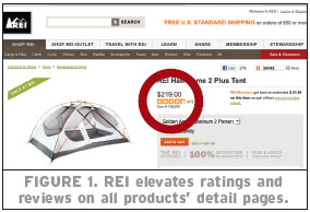 REI does a great job of bringing star rating averages to the forefront of its product detail pages (see Figure 1). In addition, the outdoor retailer exposes the total number of submitted reviews along with the distribution of ratings.