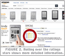 Some leading retailers provide a quick view of ratings results by rolling over a star to show a drop-down summary. As with many online innovations, Amazon executes this idea flawlessly (see Figure 2). When more information—including the total number of ratings, a link to view all reviews, and the top-three most helpful customer quotes—is quickly provided, shoppers can be more decisive in their buying decisions.