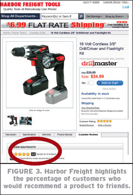 Harbor Freight is building explicit connections between ratings and the percentage of customers who would recommend the product to their friends. The example shown in Figure 3 shows that 100% of customers would recommend the product to their friends.