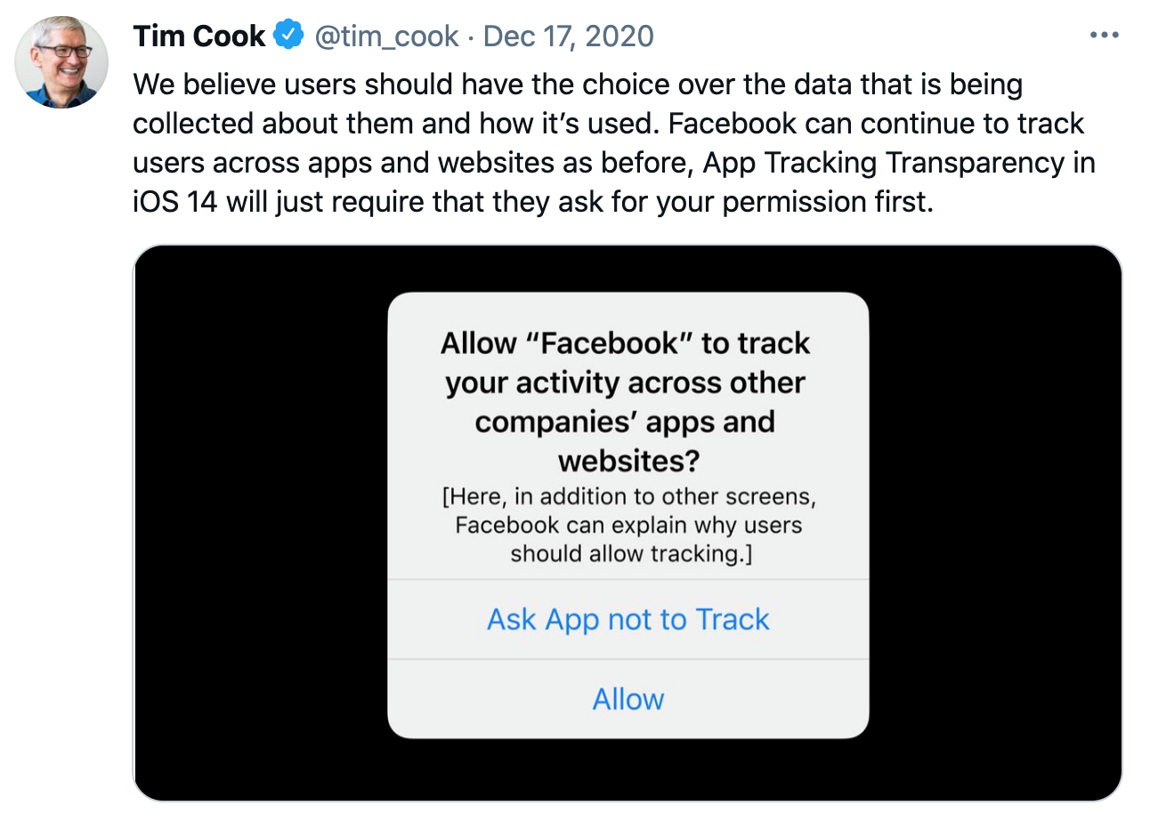 This reality is now playing out in front of our eyes. Much to Facebook’s dismay, Apple’s planned privacy update to iOS 14 will prompt users to choose whether to allow Facebook to track their phone activity to provide personalized ads. This has left Facebook and Apple bickering like two siblings fighting over who rides in the front seat.