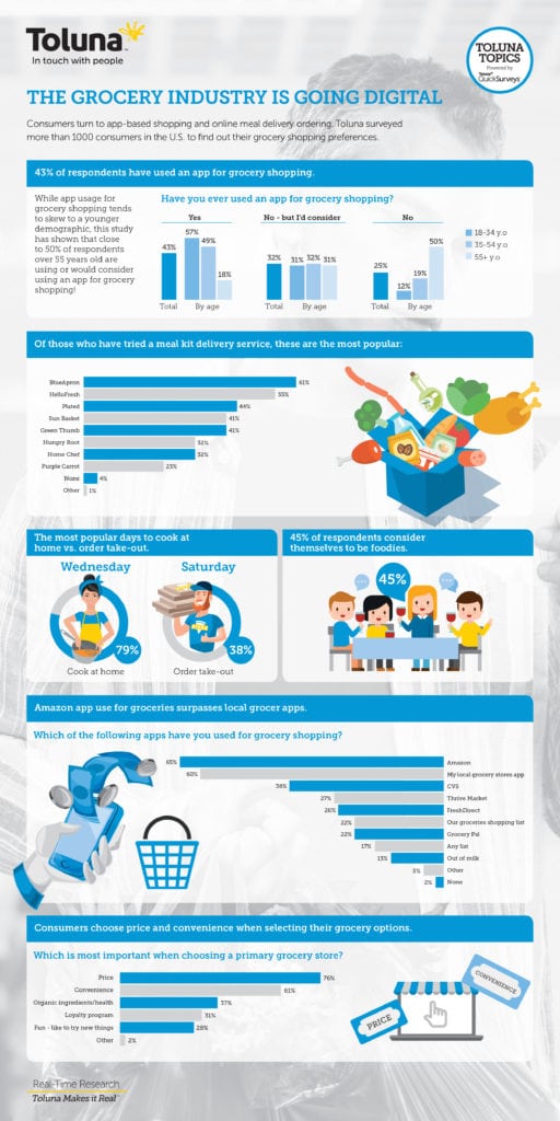 Consumers are turning to app-based shopping for meal delivery ordering. A study by Toluna found that while a younger demographic tend to use app-based shopping, 50% of shoppers age 55 and older are considering to use apps for grocery shopping. This infographic by Toluna highlights the findings of how customers are using apps to get meals delivered to their homes.