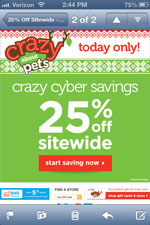 The email or Twitter or Facebook offer: Crazy Cyber Savings 25% off Email
