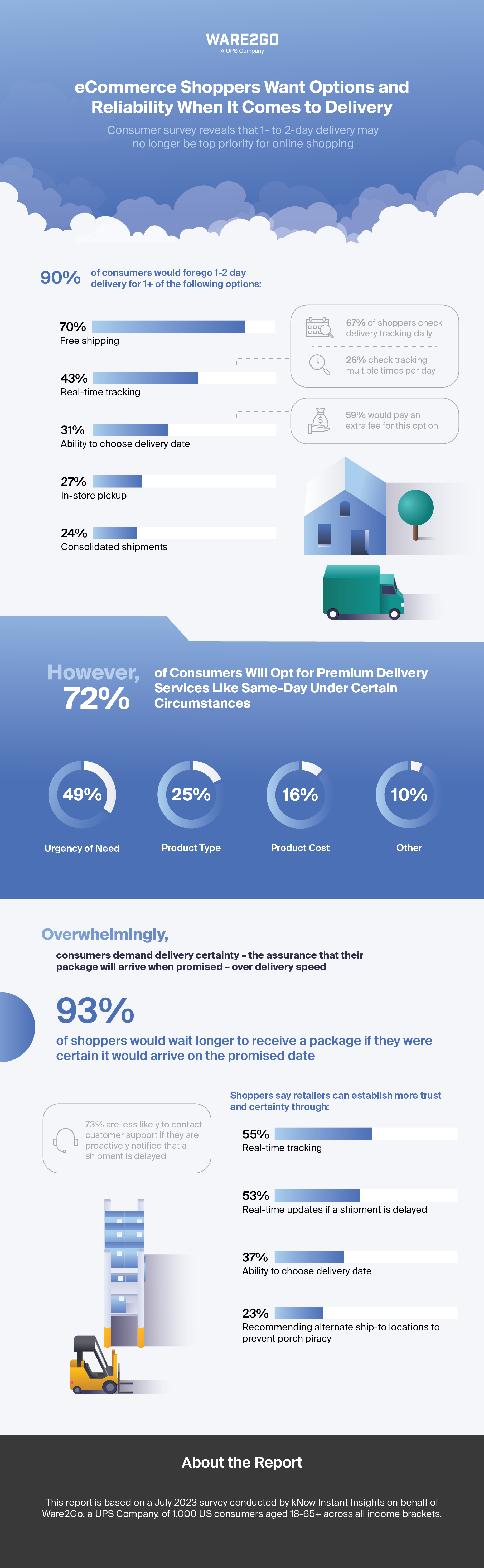In a July survey of 1,000 consumers by kNow Instant Insights on behalf of Ware2Go, nearly all respondents (90%) said could live without 1-2-day delivery if given various options instead. These included free shipping (70% of respondents), real-time tracking (43%), the ability to choose the delivery date (31%), an in-store pickup option (27%) or a consolidated shipment (24%).