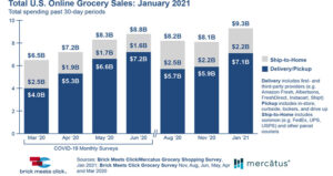 As consumer dollars keep shifting online generally in the pandemic, e-grocery in the U.S. continues to explode, hitting a high of $9.3 billion in January, up 15% from November, according to a survey conducted by Mercatus/Brick Meet Click. Home delivery and store/curbside pickup represented 77% of the total.