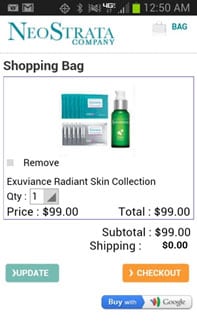 To reassure mobile shoppers who are hesitant to become mobile buyers, merchants should highlight the availability of alternative payments within their mobile shopping environments, as MarketLive merchant NeoStrata does with a prominent link to Google Wallet from the shopping cart.